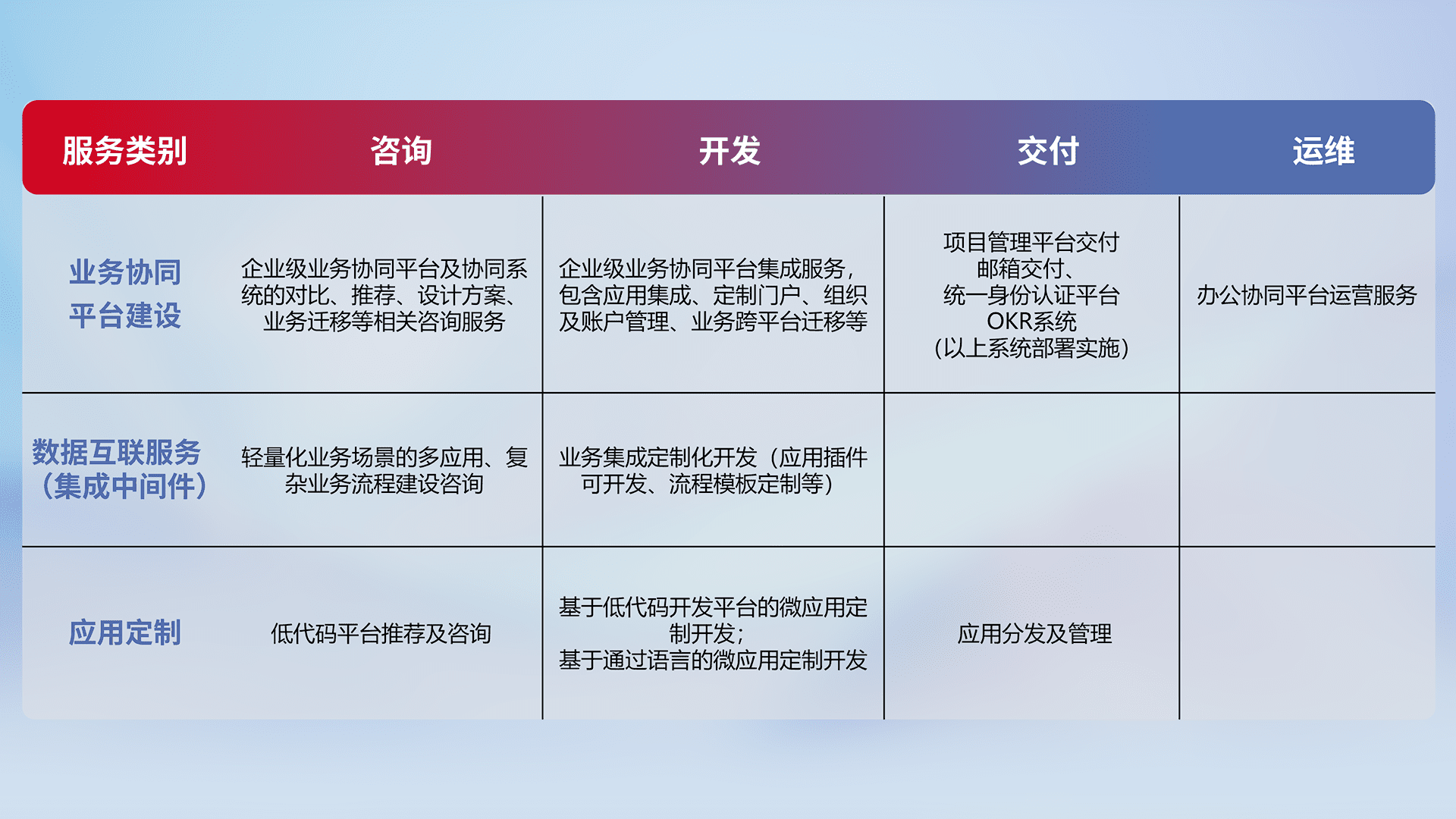针对钉钉、、、、企微、、、、IDaas等平台级产品提供产品的规划、、、方案、、、交付、、、、定制化开发等服务,,,,实现如统一协同办公、、智能客户服务、、、混合会议管理、、智能数据查询、、等业务场景,,,实现数字化转型。。。