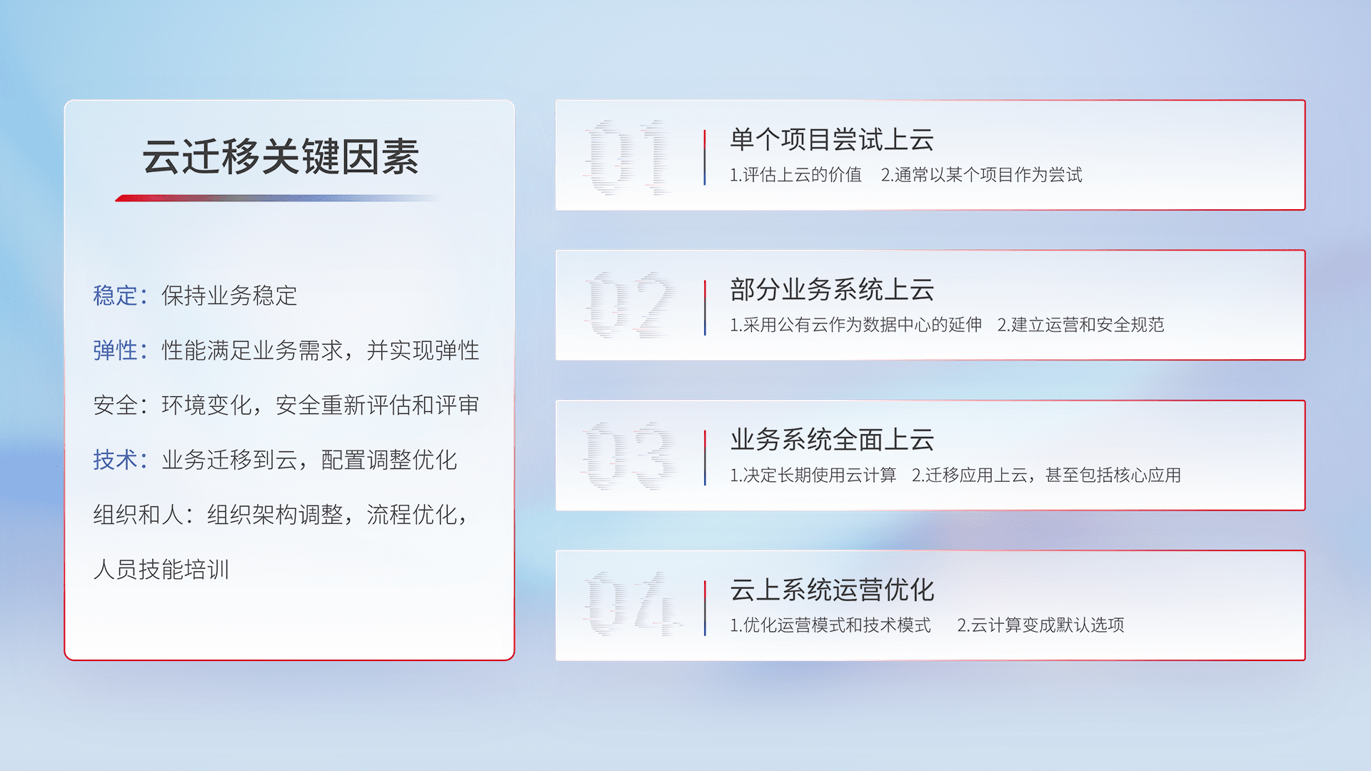 结合实际业务,,从规划设计、、云平台选型、、、云原生改造、、、数据迁移、、集成交付,,迁移全过程为客户识别最佳上云路径,,,,做好风险识别管理,,,设计网络架构、、、身份权限、、、安全审计合规、、、操作审计、、日志审计、、监控告警策略、、、、多站点容灾设计等,,,,对云上基础设施进行整体规划,,,提升IT治理水平,,以满足弹性、、、、高可用、、高性能的需求。。。。