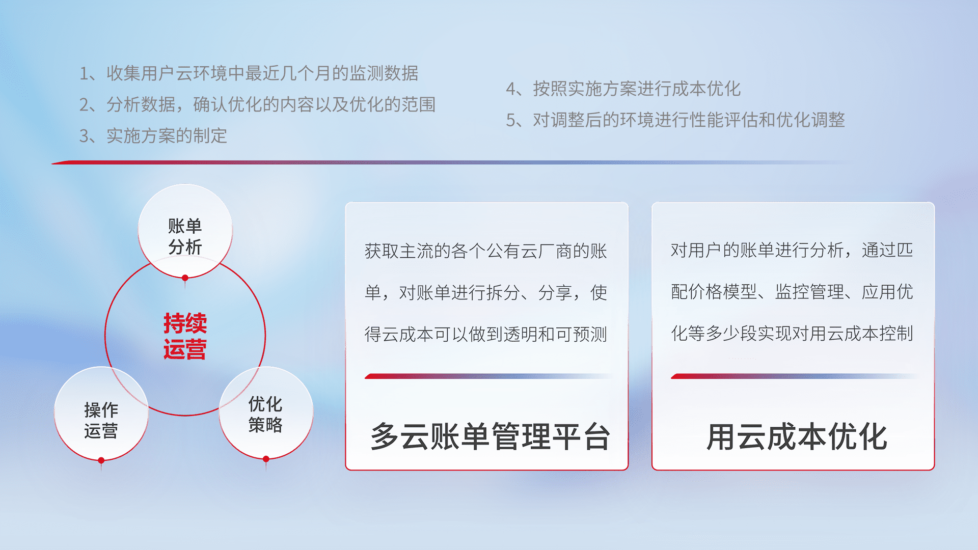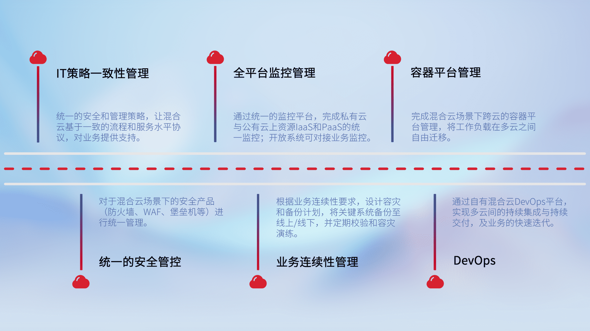 通过多云纳管,,,,以统一的资源数据模型把客户的云资源进行抽象和封装,,,进而实现对多云资源的统一操作,,,保障云资源管理的可靠性、、、、稳定性与可用性。。。。量身定制化运维内容,,,配置、、、、开发运维、、、、补丁管理、、、备份、、、、监控、、、、认证和访问管理、、、审计和日常巡检等,,,,保障在用云过程中的可靠度,,,,稳定度以及高可用率。。