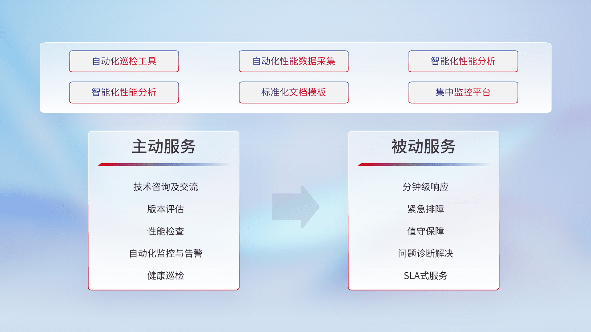 智能化工具和标准化文档,,,保障服务质量,,,提供主动服务(包含技术咨询、、、、版本评估、、、、性能检查、、、自动化监控与告警、、健康巡检)和被动服务包含(分钟级响应、、紧急排障、、、值守保障、、、问题诊断解决、、、、SLA服务)。。